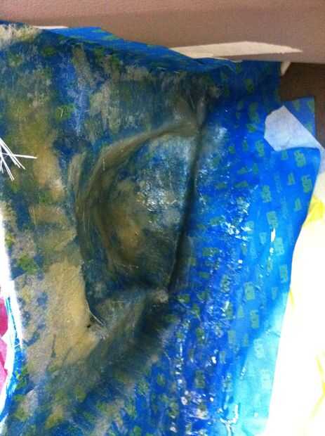 Usando la técnica de papel maché, frotis de alguna mezcla de resina en la cinta y coloque un pedazo de estera de la fibra a él. luego añadir más resina en la estera hasta que se vuelve transparente y se sienta bien en la cinta. Repetir este proceso hasta que el área está cubierta.