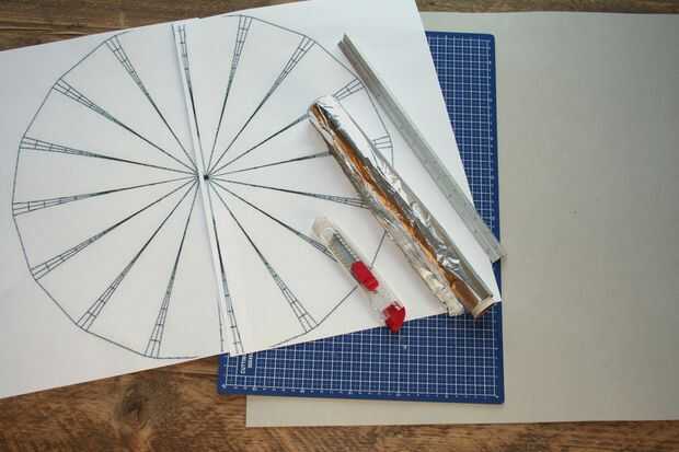 Para hacer el reflector parabólico cartón necesitas: cartulina A2, cinta, un cuchillo de la manía, una regla, un salida de impresión de la plantilla de la forma parabólica A2 (ver documento) y papel de aluminio (para hacer la versión con una capa de aluminio interior).
