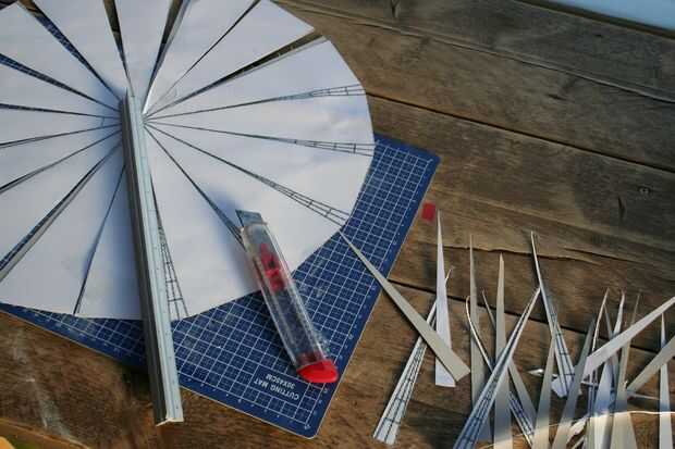 Coloque la plantilla sobre la cartulina con cinta adhesiva. Corte la plantilla fuera de la cartulina. Ten cuidado: las líneas no son rectas, sino ligeramente curvadas.