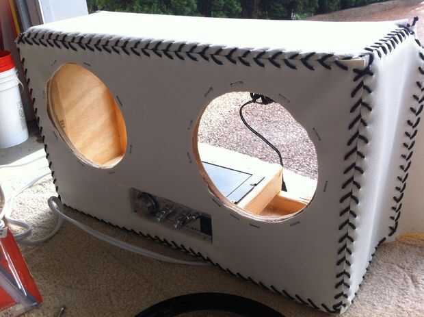 Uso de los dedos para sentir dónde están los agujeros para los altavoces, engrape el cuero hasta el marco. Luego corte los círculos. Las grapas están bien para utilizar como los bordes de los altavoces se deben cubren como mina.