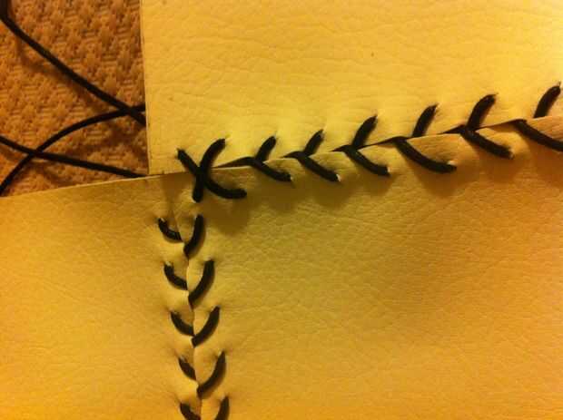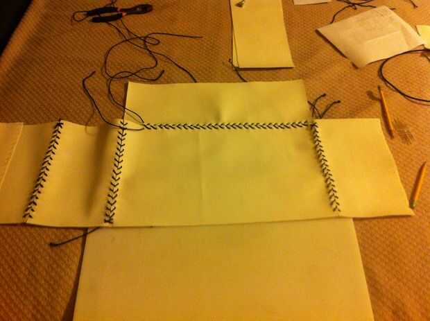 La parte más lento y tediosa de mi proyecto fue coser el cuero, sobre todo porque luché por tirar mi aguja a través de sin utilizar un sacador de cuero que sugiero altamente. Así que primera marca de donde desea que todos los agujeros (hice 1/2 del borde y una de otra). Después utiliza una puntada de béisbol utilizando dos longitudes de cuerdas superpuestas y atar los extremos. Sujete todos los lados juntos, pero dejan la espalda como una aleta.