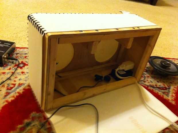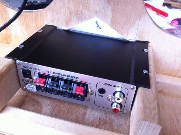 En este punto enchufe el cable de aux en la parte trasera del amplificador y puede que necesite ampliar las ranuras que hiciste anteriormente para los tapones para un mejor ajuste y verificar que la pieza de madera contrachapada posterior encaja con las muescas.