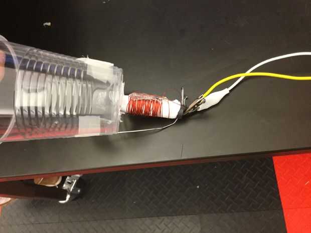 Rollo de imán sobre un papel de 2 x 6 pulgadas y cinta junto. Luego tomar la otra 2 x 6 papel y rodar otra vez. Luego enrollar alambre de cobre 80 veces alrededor de. Deje 2 pulgadas libres.