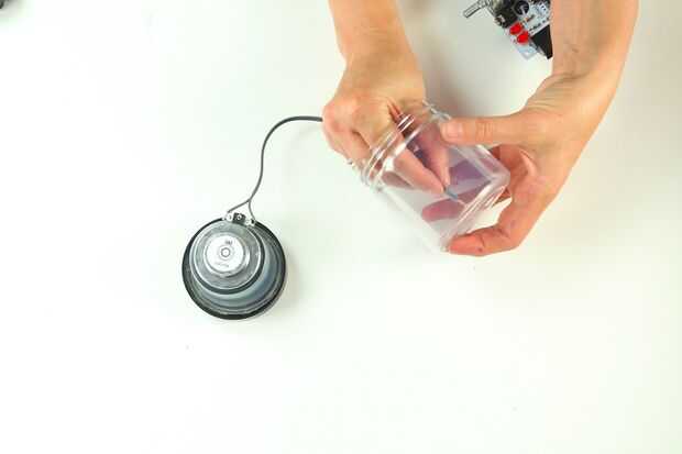 Hacer un agujero en el fondo de la olla y enrosque el cable del altavoz a través de él.