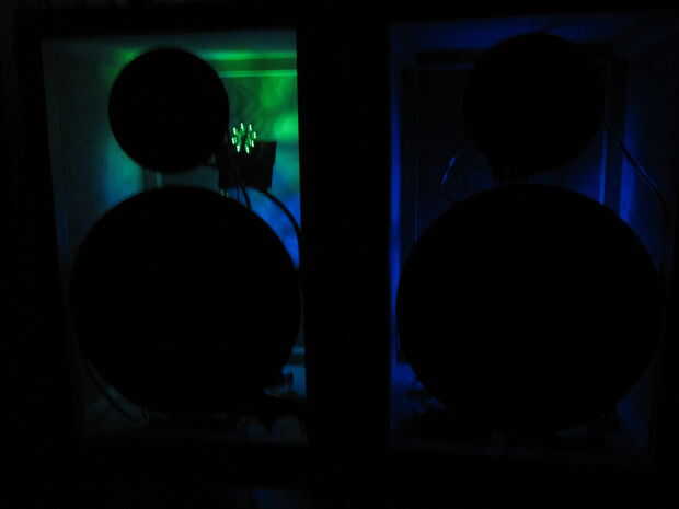 Ahora toma sus sistemas LED y conectar los cables como se muestra en la figura 6. Los cables de señal deben estar en paralelo con los drivers que corresponden a. Los dos sistemas de LED funcionan de la misma fuente, así que toma la fuente de alimentación los cables de positivo y a uno de los desnudos tornillos de la placa terminal del alambre de la soldadura. A continuación, tomar la fuente de alimentación los cables de tierra de los LEDs y soldar a otro tornillo. Los tornillos de la cinta con cinta aislante para seguridad (cuadro 7). Ahora instalar los paquetes de LED dentro de la caja sin embargo te gusta. Para alimentar los LEDs, se aplica una corriente a través de los tornillos (que tienen los cables en el otro lado) desde el exterior (cuadro 9).