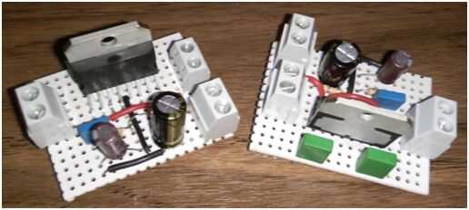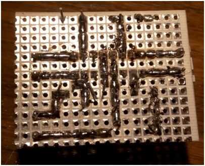 Así que hicimos la primera opción, nos soldó con autógena los dos amplificadores y sus componentes en una placa de prototipo.