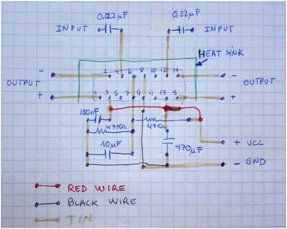 En mi caso he utilizado terminales de tornillo para conectar las salidas (altavoces) y la tensión de alimentación pero no son necesarios, usted puede utilizar los cables directamente como lo hice con las señales de entrada.