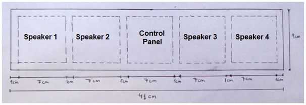 Plan de visión. El hueco central está vacío para el panel de control y los otros son de cuatro huecos para los altavoces. En panel de control vamos a poner los interruptores, el potenciómetro, el conector y los conectores de energía.