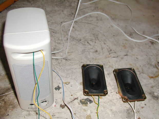 Sólo usé una de las cajas de altavoz para alojar todos los cables pero puedes usar algo más pequeño. Esto va en el oso. Asegúrese de que siempre están encendidos los altavoces y el volumen al nivel deseado.