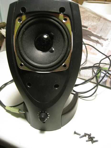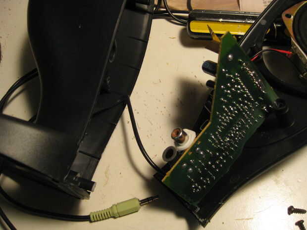 En primer lugar, eliminar las cubiertas o pantallas. Desenroscar todo. Si todavía no viene aparte, haciendo palanca, abrirla con un destornillador o algo. Que no necesitan eso de plástico de todas formas. También Retire la placa de circuito. Probablemente es en el altavoz derecho. Corte el cable que va desde el conector de audio a la placa de circuito si se pueden quitar. Asegúrese de guardar la perilla de volumen.