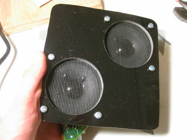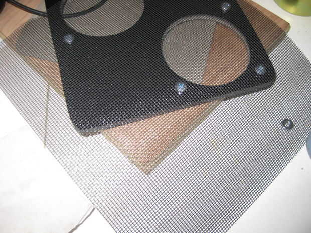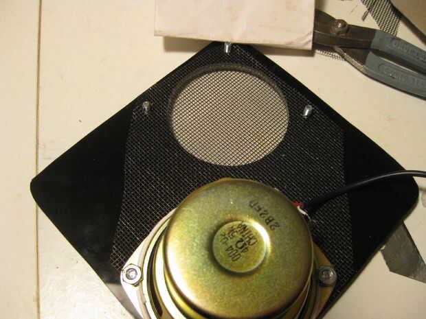 Ahora que tiene los orificios de corte, los altavoces pueden fijarse. Aquí es donde entra esa pantalla. Corte una sección sobre el tamaño que necesita. Esto es más fácil si es la clase que no es realmente de metal. Recortar para que encaja perfectamente y deja espacio para donde vas a poner la perilla del volumen. Luego empujar los agujeros para los tornillos y poner en la pantalla, los altavoces y las tuercas. Debería verse como la última foto. P.d.: Esto resultó para ser una ventana importante. Metió en problemas. OOPS... Así que asegúrese de que su ventana es realmente viejo.