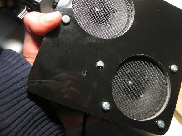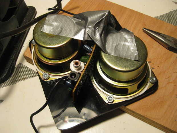 Ahora tienes que colocar la placa de circuito. Mina tenía cuatro cosas importantes que se le atribuye: una perilla de volumen, un pequeño LED verde, un enchufe para la energía y un enchufe para el altavoz izquierdo. Estos últimos dos se vienen más adelante y el rostro lejos el plástico. El mando y el LED pegaremos en la parte delantera del plástico, por lo que necesitan los agujeros. La marca que desee y taladro. Una vez hecho esto, poner la placa de circuito entre los altavoces para que todo esté en el lugar correcto. Encontré que la manera más fácil para unirla es con un pedazo de cinta adhesiva para conductos (nadie va a verlo).