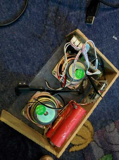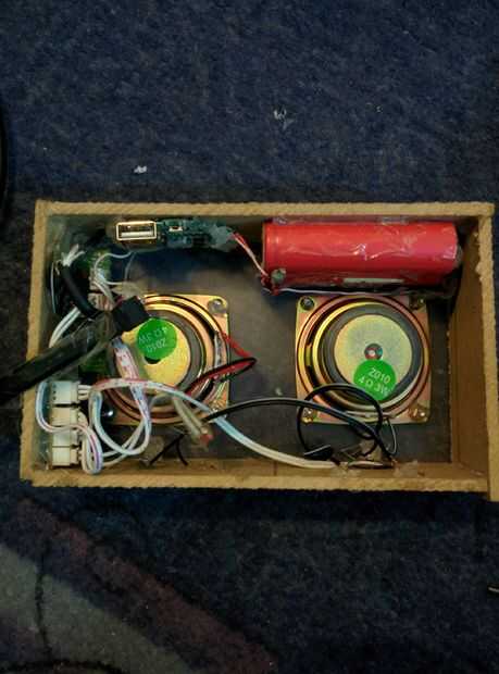 Ahora pone los otros componentes en la caja y encolar en su lugar. También conectar los LEDs a los parlantes. Habrá 2 cables que salen del altavoz. Busque positivo y negativos y su LED que la soldadura. Más fuerte será el sonido, se iluminará el LED más brillante. También poner las baterías de ion de litio con el cargador en él y compruebe que cualquier corto circuito. Conecte todos los cables y agujero de taladro para su audio en el puerto y listo. :)