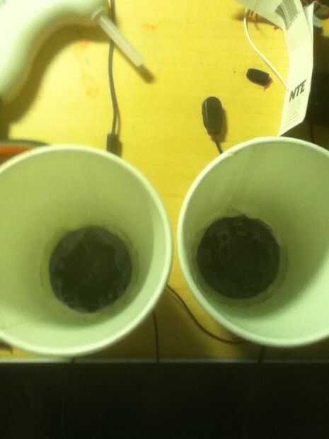 Tomar una de las tazas y de los altavoces y pegamento caliente juntos. Archivo el altavoz en el orificio de la cup.then hacer lo mismo para el otro.