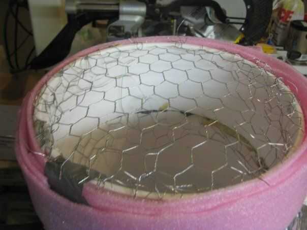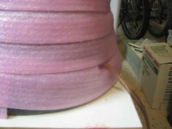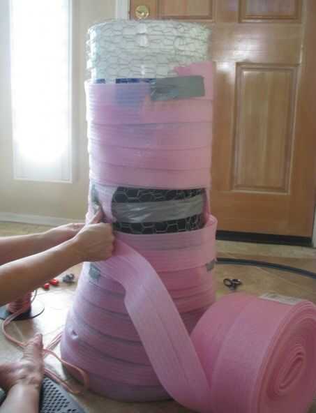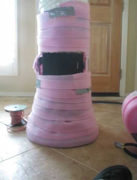 4) después han envuelto su tiki en la primera capa de alambre de pollo, tomar tu espuma aislante y abrigo el tiki todo en ella, y seguro que con un poco de cinta adhesiva Asegúrese de no envolver el tiki donde está apuntando el altavoz. Esta espuma tiene dos propósitos: