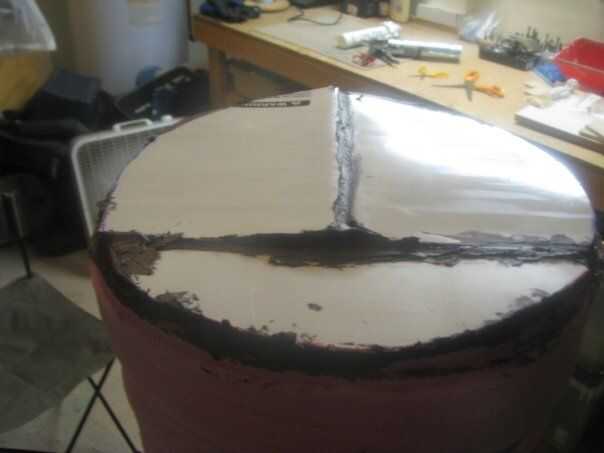 6) a continuación, un top es necesario para el tiki. Lo primero que tienes que hacer es cortar un círculo de alambre de pollo y el alambre en el borde superior de la carrocería, luego cinta poco flexible de espuma en la parte superior de la misma. Tomar el cubrir plástico y mida suficiente material para cubrir la parte superior de su tiki. Una vez que su medida de plástico, recortar con la herramienta dremel. Pegamento en la parte superior con su líquido de uñas.