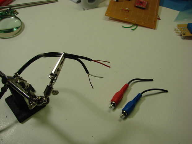Cortar los conectores RCA de un extremo del cable. Normalmente corto para que tenga suficiente cable para que los conectores son utilizables en proyectos futuros. Tira y el alambre de la lata y luego conectar los dos terrenos juntos y los 2 cables de señal juntos. La salida del altavoz es mono y la entrada de receptor de cine en casa es estéreo para alimentar a la misma señal en los terminales izquierdos y derecho del receptor de cine en casa.