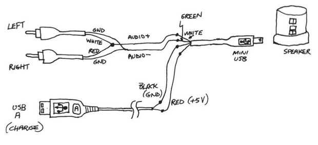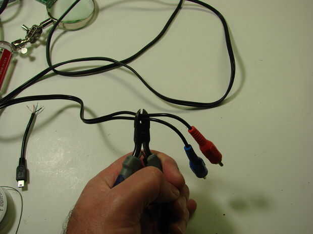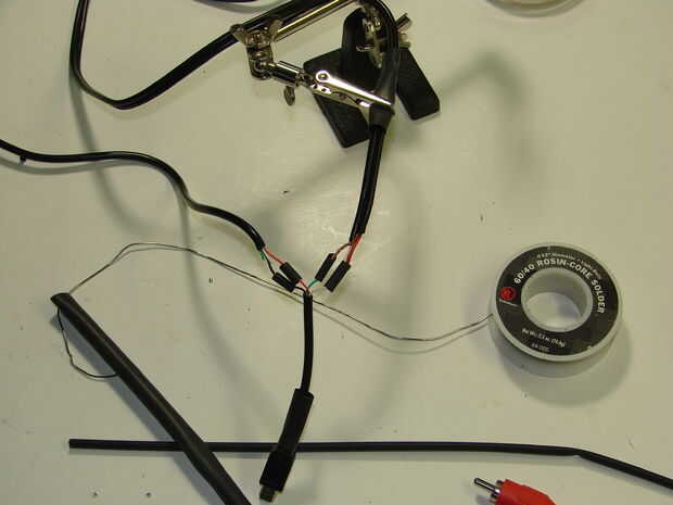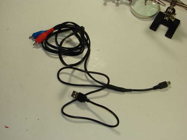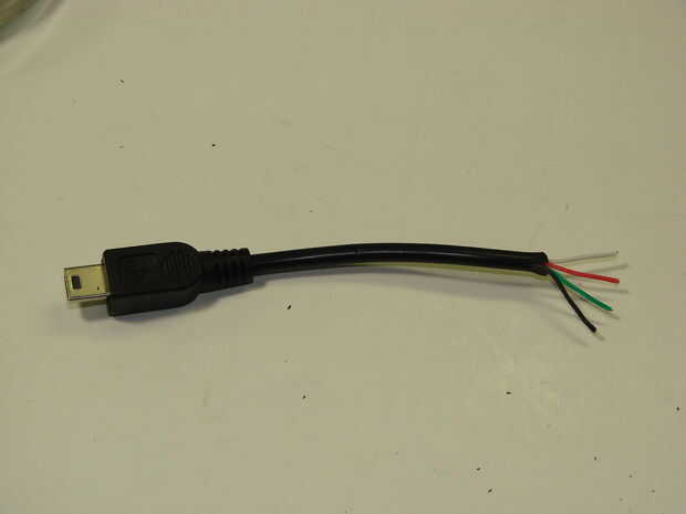 Primero cortar el conector del cable USB suministrado en unas 3 pulgadas de la parte posterior del conector. La tira y los extremos del cable con soldadura de estaño. Esto debe hacerse en las USB A y B conector lateral. EN el lado, no necesitamos el cable verde y blanco como estos ahora llevan audio por el conector mini-B. Aislar los extremos de estos 2 cables para que queden eléctricamente aislados de los cables. Asegúrese de no crear un cortocircuito.