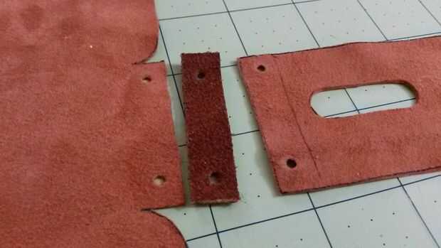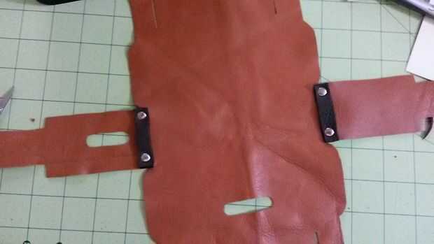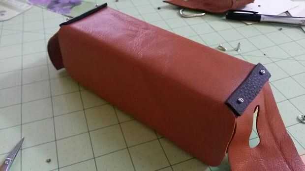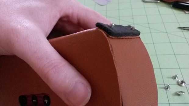Los lados en el cuerpo del remache. Cuando hice esto, estaba fuera de pequeños remaches y es necesario añadir un poco de piel más gruesa en las esquinas así que encajarían en los remaches. También es muy elegante y protegerá, por lo menos, las esquinas inferiores si se cae.