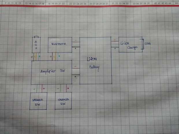 Yo he colocado mi interruptor en el centro de mi circuito. Todo es para la batería así que usted puede cargar la batería cuando no enciende. Con el interruptor habilitar el módulo bluetooth, amplificador y LED. En un proyecto de futuro a añadir un interruptor adicional para el módulo bluetooth, porque incluso cuando estoy jugando a través de la toma de audio mi módulo bluetooth está consumiendo energía.