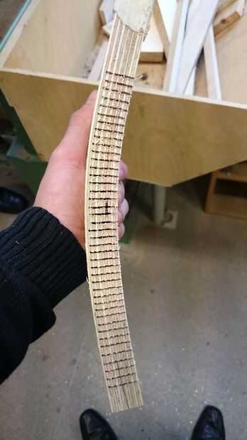 Si esto suena horrible y como mucho que es utilizar una sierra de cinta y crear una plantilla para que la sierra corte en la parte superior de la madera dejando 1mm antes de cortar totalmente aunque la madera, el resultado final debe parecerse a un peine. Una vez completa, utilice el método de agua caliente para doblar la madera pero ahora tiene el reto de no ajustar la madera. Esto sigue siendo la forma más fácil de conseguir la curva en mi opinión.