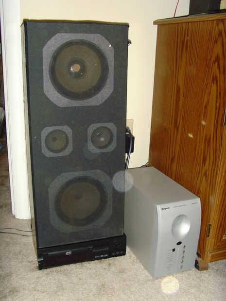 También tenía un viejo reproductor de DVD y algunos DVD acaba de poner en el suelo de mi dormitorio, pensé para mis adentros, "¿Qué mejor lugar para ponerlas que dentro de un altavoz de la torre?" Que de la maceración cuando comenzó y nació este instructable. He modificado el reproductor de DVD para caber en el altavoz (conserva todas sus funciones) y había instalado 3 estantes para el DVD. También puse la cara del altavoz en las bisagras, para hacer el DVD oculto y fácilmente accesible. El producto terminado se muestra en la imagen siguiente.