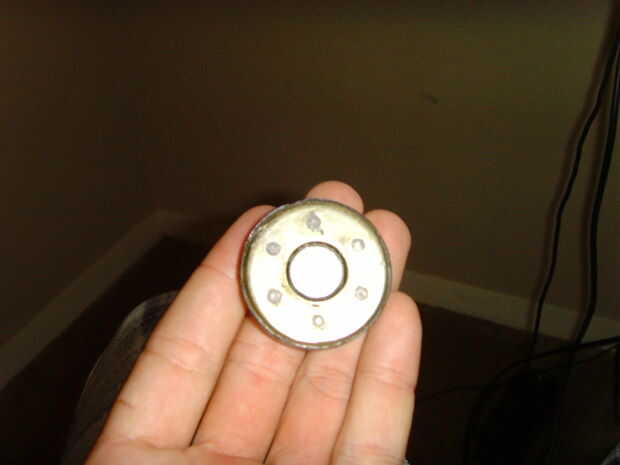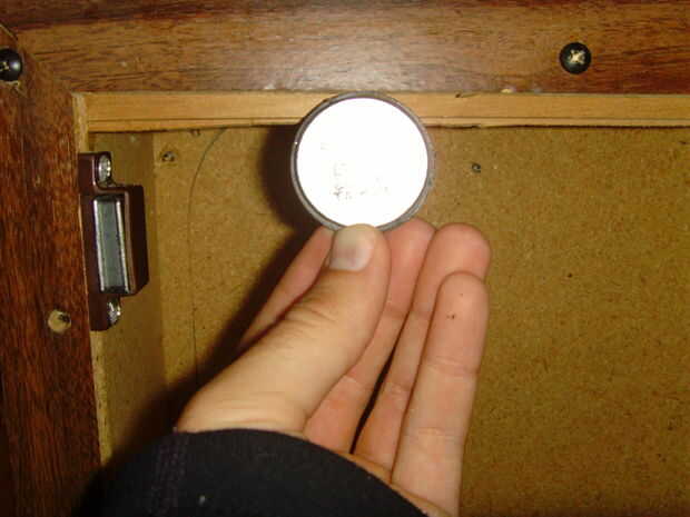 ¿Alternativamente: Recuerde que los imanes de los altavoces en el paso 3? Aquí es donde podemos utilizarlas. Resulta que el metal que los altavoces están compuestos también es magnético. Si usted asegurar uno de los imanes del altavoz en la posición correcta (ver foto 1), se captura el metal de altavoz en la puerta y mantenga cerró! Recomiendo usar sólo los imanes más pequeños, como los más grandes pueden ser demasiado fuerte y difícil de instalar. Un buen epoxy debe mantener el imán en su lugar.
