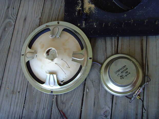 Primero cada uno de los oradores desenroscarse antes apalancándola los imanes con un destornillador. Después de medir los altavoces más grandes, encontré que tenía que serrar la parte trasera si me iba a caber de DVD detrás de él. Utiliza la sierra caladora con una hoja fina vio cada uno de los cuatro brazos sosteniendo el imán en su lugar y luego atornillar los altavoces en el lugar. Este paso dio hizo que los altavoces se entrometen en la caja del altavoz 2" menos de lo que habían antes, permitiéndome ajuste de DVD detrás de ellos. También utilizo uno de los imanes del altavoz en mi nevera ahora!
