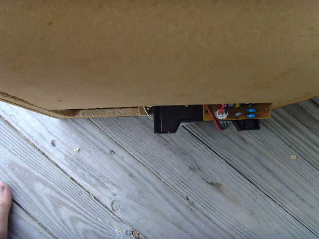Una vez que asegura la parte posterior, el lector de DVD todavía pegado por la parte trasera (Foto 3). Para cubrir este defecto, fabricado una caja de 1/8 planchas de madera (fotos 4 y 5). Asegúrese de dejar espacio para el A / V y potencia cables para alcanzar el DVD player puertos. Una vez que fue hecho, todo lo que tenía que hacer era pegar la pieza posterior y viola! No más exponen electrónica (foto 6).