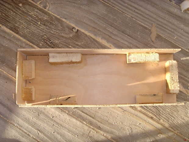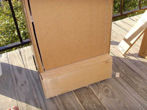 Creo que lo mejor aquí sería cortar y fijar una hoja de madera contrachapada de 1/8" hacia atrás para cubrir el agujero. En mi caso, quería utilizar como poco material nuevo como sea posible y mi lector de DVD pegado por la parte trasera unos 2". Por lo tanto, tuve que recortar la pieza trasera original que corté, y aseguraron a la espalda con unos restos de madera que tenía de los cajones (Foto 2).