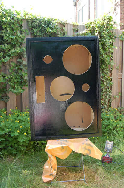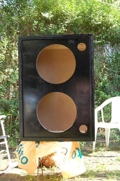 Ya que mi sistema de sonido móvil va a ser utilizado al aire libre necesitaba algo para proteger la madera de la madre naturaleza. Por lo tanto utilicé pintura no regular pero tar. Esto realmente no se ve muy suave, pero protegerá a mis altavoces mejores que regular pintura hogar.