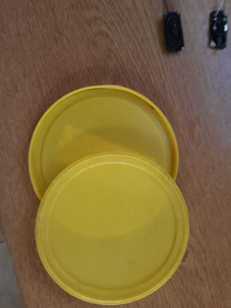 Las tapas eran de latas de fórmula infantiles pero cualquier plástico flexible suave funcionará como su doblaje como una caja de resonancia.