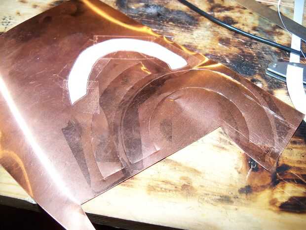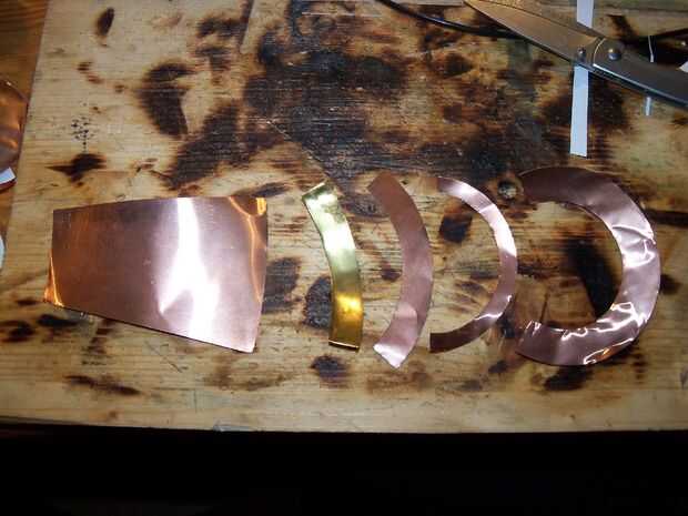 Para cortar todas las piezas, primero imprimí el plano del último paso. Aproximadamente corté las piezas, por lo que les podía pegar en el metal de hoja con cinta adhesiva. Me aseguré en cinta sobre las líneas, de lo contrario que el papel se corte durante el corte. Para cortar las piezas de metal, simplemente usé un cuchillo y para las partes que no cortan acaba había doblado lo hasta que explotó. Esto funciona bien con el cobre que tengo ya que es sólo 0,1 mm de espesor. Si es demasiado grueso para romper hacia fuera, utiliza tijeras para cortar las piezas. Este fue el caso para el anillo de latón, ya que es de 0,3 mm.