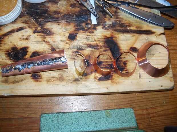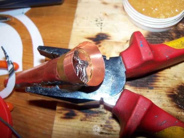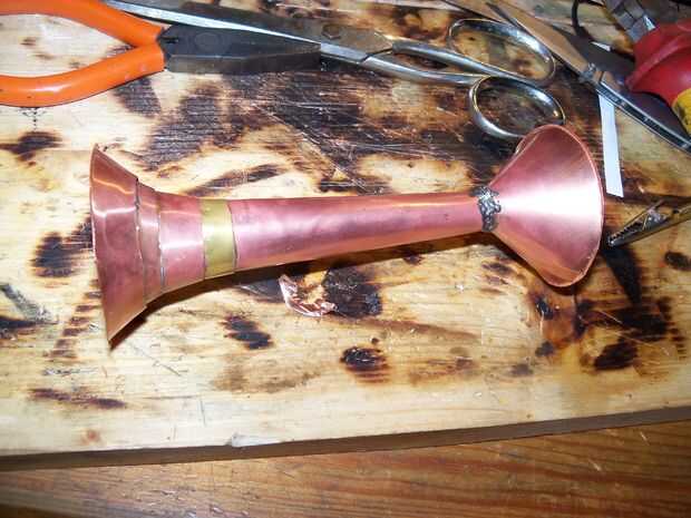 Para soldar todo junto, primero cubrir los bordes quería soldar, luego doblará los anillos más o menos en forma y los soldados juntos. Después de que usé mis tijeras para conseguir todo lo agradable y redondo. Entonces había suelda los anillos juntos. He intentado utilizar como soldadura poco posible, pero no siempre lo logran. Todo lo habría hecho ver más agradable, pero de esta manera mantiene unida. Para arreglar todo a un altavoz que hice otro cono que fue en el extremo delgado del cuerno. No tengo ni idea si es mejor utilizar un cono o simplemente un pedazo plano de metal, pero el cono se ve mejor y es un poco más estable. Este cono tiene aproximadamente el mismo diámetro que el orador, que i superglued a él. En este punto, también había soldado los cables al altavoz.