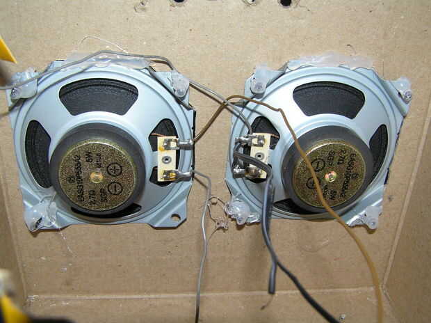 Muy bien ahora que haga el orificio en la caja de su tiempo para poner los altavoces! Pero antes de poner los altavoces en TI deben puente dos altavoces juntos. Volver a la corte. Alinee los altavoces con el agujero. Una vez que se alinean comenzar a poner los tornillos. PERO ANTES DE PONER LOS TORNILLOS EN PUCH POCO AGUJEROS A TRAVÉS DE LA CAJA DE LA PARTE POSTERIOR PARA VER DONDE PONER LOS TORNILLOS Esto debería ayudar. Después de atornillar los tornillos (del frente) toman tu pistola de pegamento caliente y ponen pegamento sobre los tornillos te. HACER ESTO EN LA PARTE POSTERIOR DE LA CAJA! Luego poner un poco de pegamento alrededor de los bordes de la parte posterior del altavoz. El pegamento ayudará a que el orador estancia unida a la caja. Después de termines con la instalación de los altavoces.
