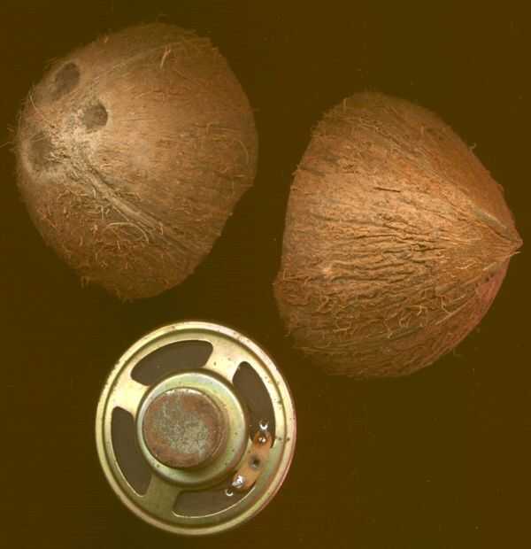 Cáscara de un coco. En dos mitades, con una ruptura y no hay piezas que faltan. Lo suficientemente grande para acomodar al altavoz dentro.