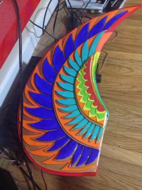 la parte posterior es una pieza de MDF pintado en rojo en los bordes. Trace el contorno exterior de la mayoría del dibujo en un trozo de MDF de 1/4. entonces uso un jig Sierra para cortar, no tiene ningún borde dentado.