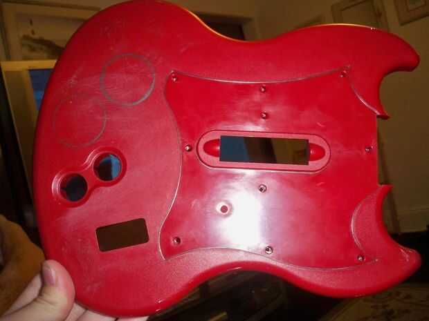 Guitar Hero de las rocas, pero realmente necesita algunas luces para amenizar la destrucción virtual.¿Qué hacer? CRAM en algunos LEDs!Paso 1: Abre Las dos piezas la parte de atrás de la guitarra es sólo una cuestión de sacar los tornillos de 16. Hay