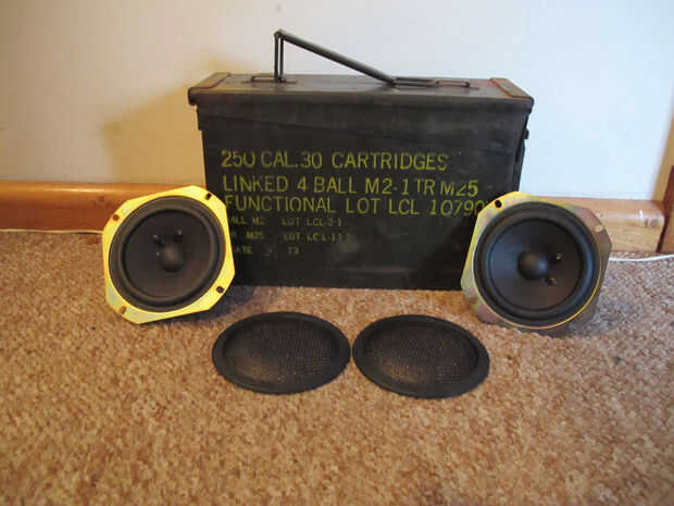 2 x 4" altavoces de 16 ohmios, destripados de un par de Sanyo estéreos altavoces de que alguien me dio en su camino a la papelera...