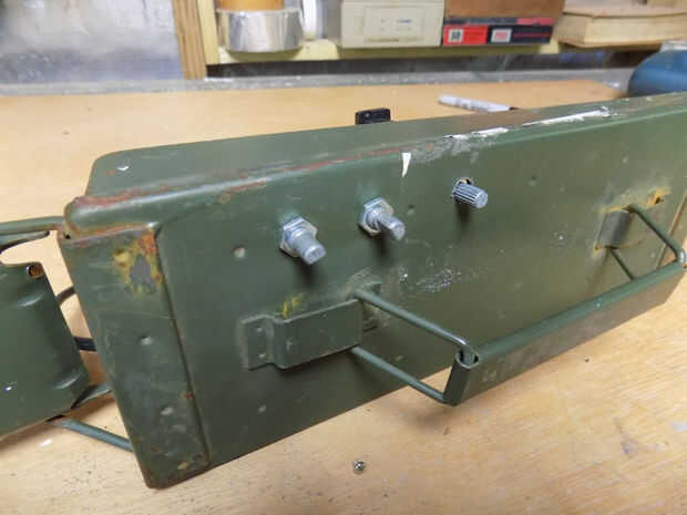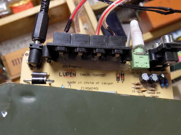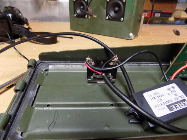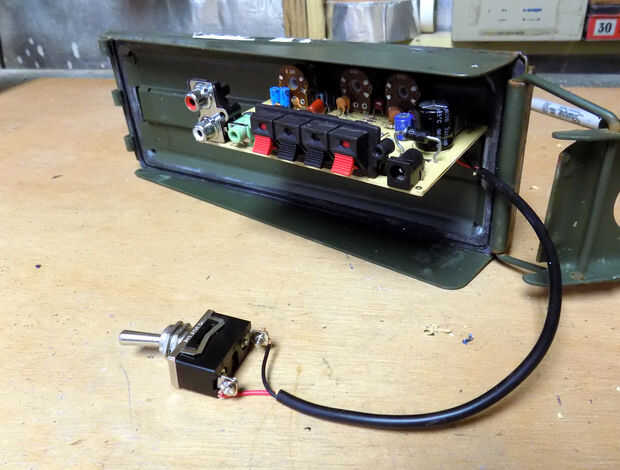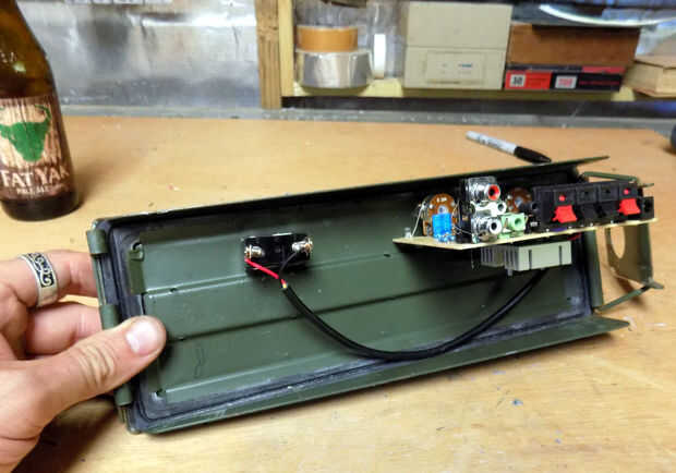 1. decidí conectar el amplificador a la tapa de la caja de munición. Fue fácil y también fácil de atar. Podrías probar y poner el amplificador en la parte inferior de la caja de munición pero resulta duro unir el enchufe de alimentación, cables etc.. Taladrar los agujeros para las macetas (controles de volumen) y cambiar