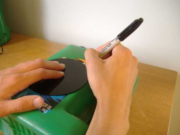 Puesto que el ponente ha sido la misma medida alrededor de un CD, decidí usar un CD como plantilla. Encontré donde quería el altavoz, alinearon el CD y marcado alrededor de él con un marcador. Luego tomé mi cuchillo y cortar a lo largo de la línea.