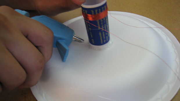 Con la creación de la bobina se han creado los componentes principales. Para ayudar a la función de altavoz vamos a crear una estructura de soporte de tiras de papel. Tomar dos tiras de papel de 2 X 8 pulgadas y doblarlas hacia atrás y hacia adelante haciendo pliegues de 1 pulgada como se muestra en la imagen.  Estas tiras de papel se utilizará para apoyar la placa y mantenerlo centrado sobre la operación durante de imán. Cinta de una de las tiras de papel de 4 pulgadas desde el centro de la placa como se muestra en el cuadro 1. Repita el procedimiento en la segunda tira.