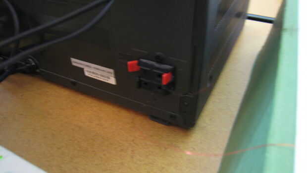 Ahora que tenemos el altavoz montado vamos a través de los pasos para conectar el altavoz a un sistema estéreo (amplificador). Antes de que el altavoz se puede conectar, la primera.5 pulgadas de capa en el cable de la bobina conduce deben eliminarse. Este procedimiento permitirá una conexión eléctrica con el amplificador. La forma más fácil de completar esto es utilizando un encendedor de bolsillo. Encender el mechero y calentar el primer.5 pulgadas de cable de conexión en el cuadro 1; Esto quemará la capa y dejar un alambre de cobre desnudo. Repita con el segundo cable de conexión. Ahora estamos listos para escuchar el altavoz funciona. Para conectar el altavoz a la toma del amplificador uno de los cables de la bobina y conecte a la red en la parte posterior del amplificador luego conecte el otro cable en el puerto negro. Los puertos de un simple amplificador de hogar se muestran en la figura 2. Espero que el altavoz de la placa de papel le proporciona un sencillo proyecto de entretenimiento para los niños o como complemento de un plan de estudios de física.