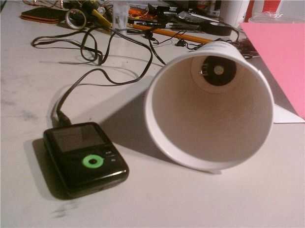 y... aquí... que... ir...Un Extra grande papel café de Tim Horton--(donde ella puso todo)Y, un altavoz de agudos de un viejo sistema de altavoces, que necesita una fuerza de concentración, un.. .esperar pues... Megáfono, oh tal vez que es más una ide