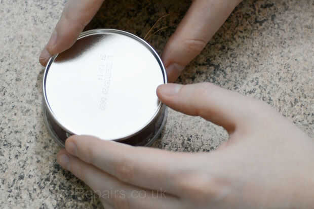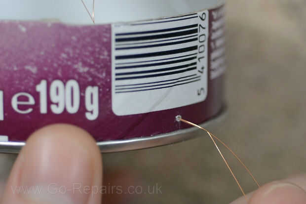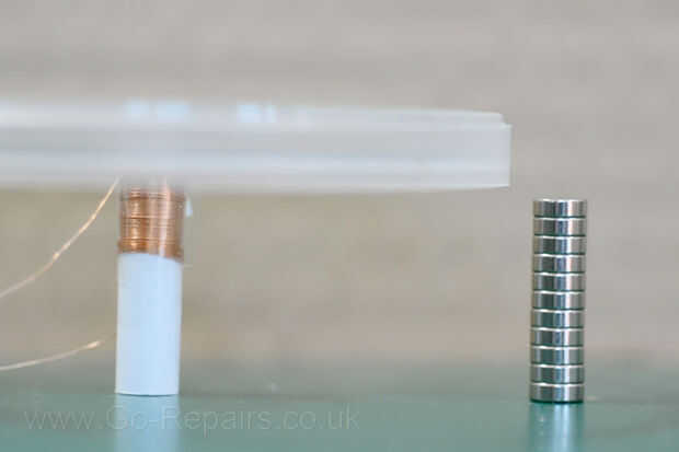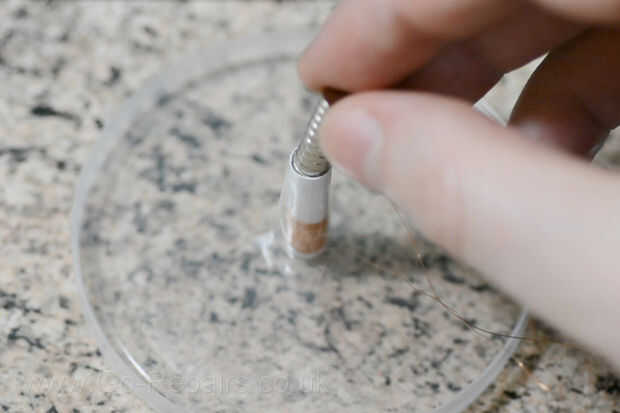 Coloque la pila de imanes en la bobina mientras que es al revés. Ahora Atornille los cables a través del orificio hecho en la lata de Pringles. Coloque su puede boca abajo sobre la tapa, asegurándose de que es central, medida que se acerca a escuchar los imanes un chasquido. Asegúrese de tirar a través de cualquier exceso de alambre.