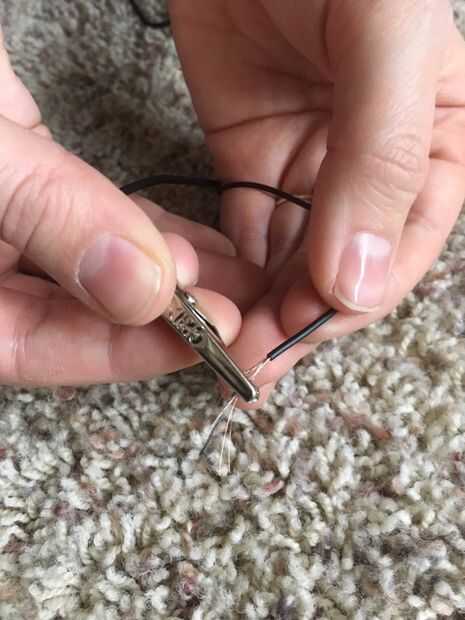 clip pinza de cocodrilo a cada extremo de la arena de su altavoz de punto. Al otro lado de dos clips de cocodrilo debe sujetarse a uno de los cables de dos auriculares.