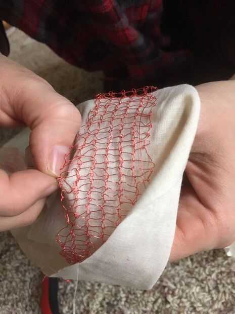 Coser el altavoz en la pieza de muselina. No te preocupes de coser cada pequeña parte de él, lo puedes hacer cada pocas pulgadas más o menos. Sólo queremos que se adjunta. En esta imagen, estoy utilizando el cable actual para unirla, que también funciona bien en lugar de un hilo y aguja.