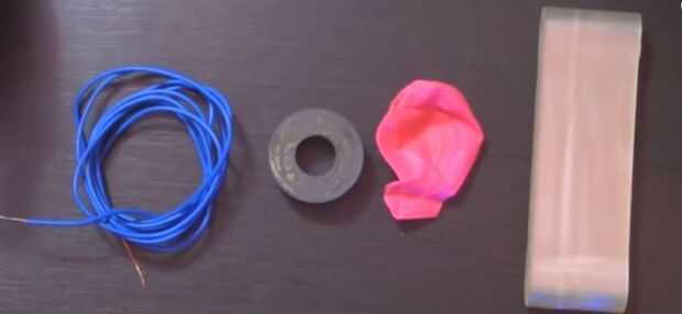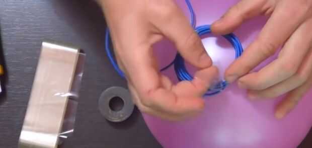 Cuanto más grande el globo – el más fuerte sería el sonido! Enrolle los cables alrededor de su mano y fijarlas con la cinta, medir previamente el diámetro de un imán. Pele los cables y fijarlas con la cinta de scotch en un globo. Es preferible que los cables se acueste mejor a un globo.