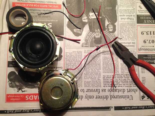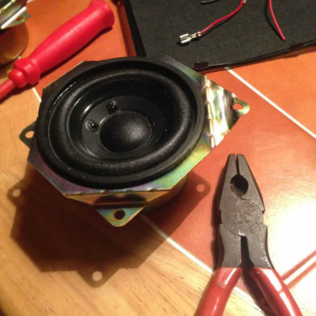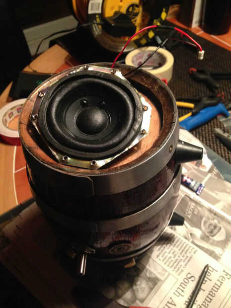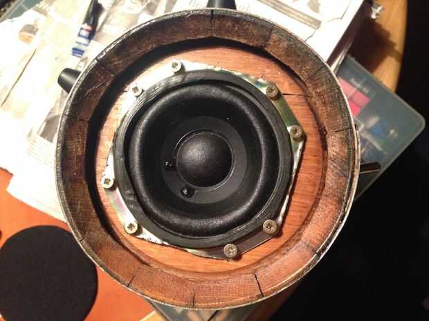 Esquinas de oradores debían cortarse para caber el barril. Agujeros para tornillos se hicieron con el punzón. Los cables conectados y equipados de altavoces.