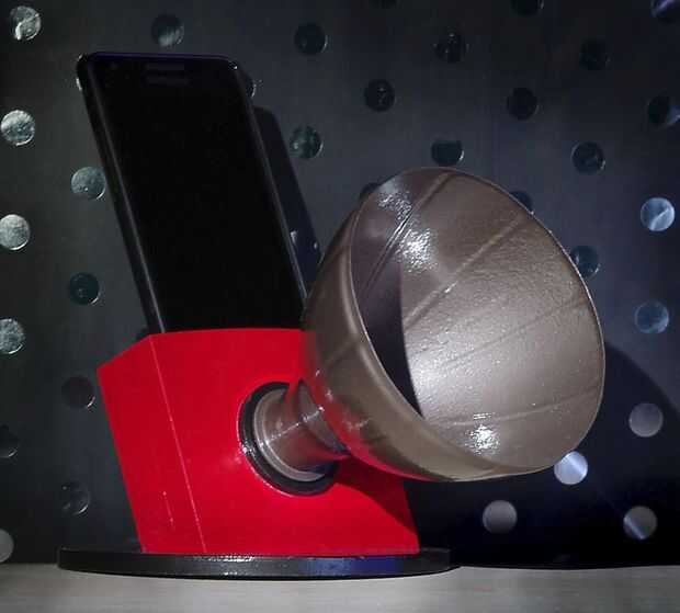 La idea detrás de este altavoz del teléfono es muy sencilla: las partes superiores de botellas de refresco son corte, pintadas y luego atornilladas en una toma de corriente en el cuerpo del altavoz del teléfono, que consta de la tapa (modificada) de una botella de refresco pegada en su lugar.